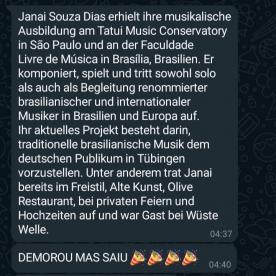 Unser talentierter brasilianischer Musiker bringt mit seiner warmen Stimme und seinem unverwechselbaren Rhythmus Lebensfreude pur auf jede Veranstaltung. Ob Hochzeit, Geburtstag, Firmenfeier, Sommerfest oder kulturelles Event – seine Livemusik sorgt für unvergessliche Stimmung und tanzbare Atmosphäre.
